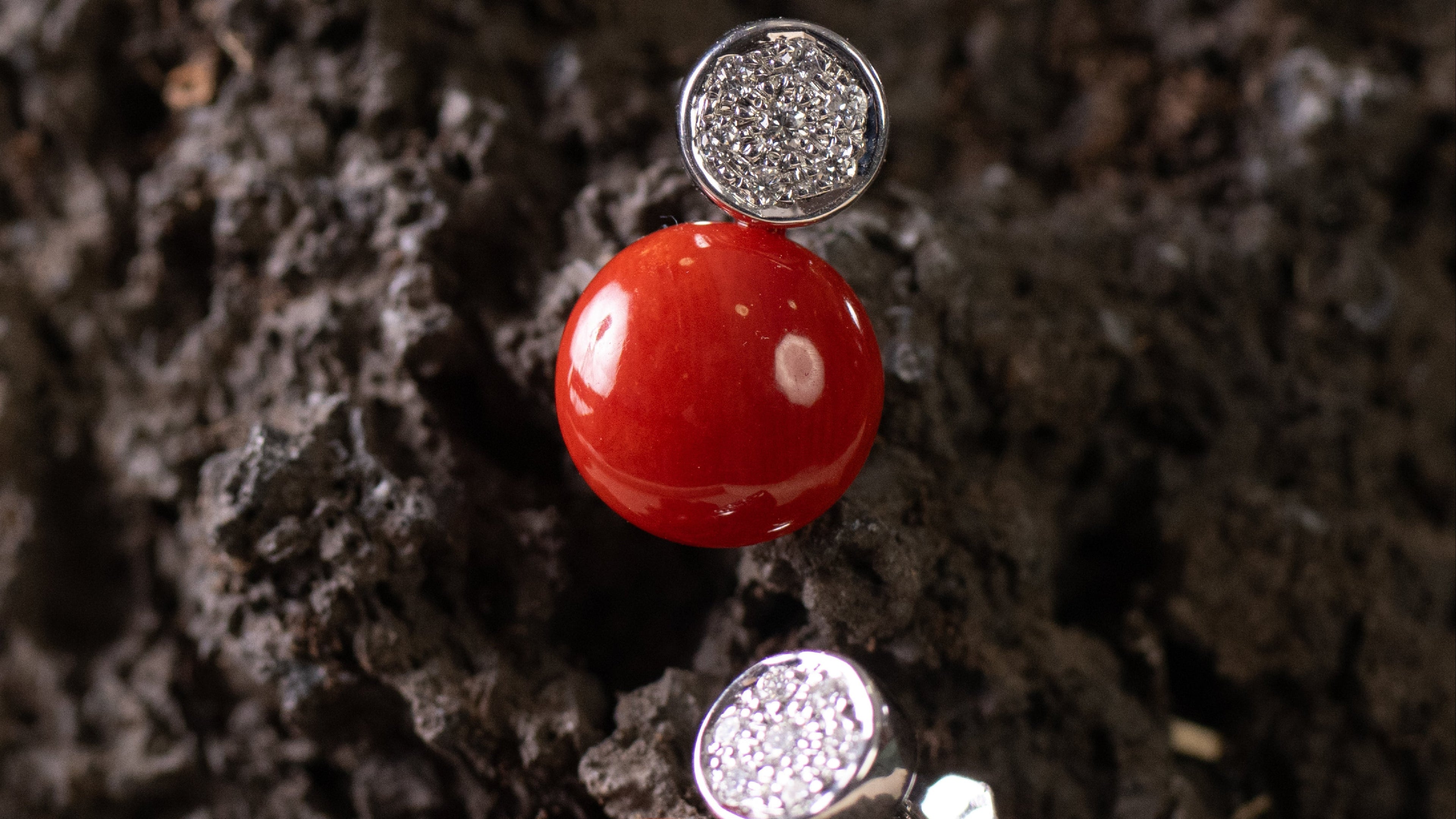 Orecchini in oro bianco 18 kt. con bottoni di corallo del Pacifico e diamanti