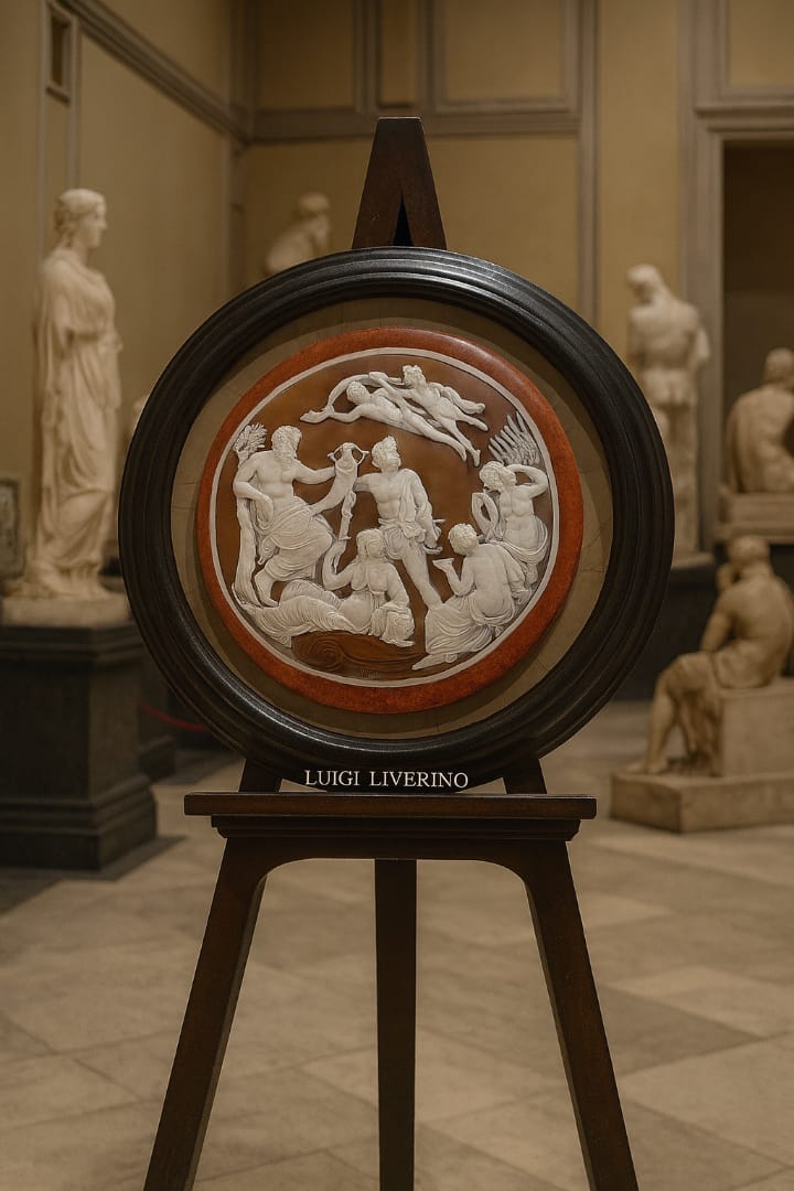 Handmade reproduction of the "Farnese Cup" on sardonic shell - 'Cassis madagascariensis' engraved by hand-, mounted on lava stone, ebony and red French marble. Unique example in the world.